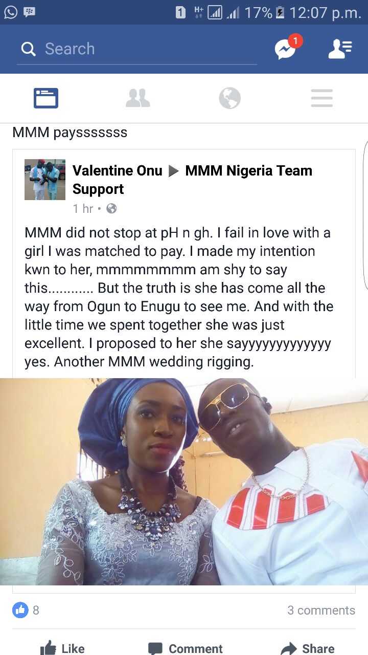 People take risk though! I guess from every bad situation, something good can pop up. An Enugu based young man found love with anonymous lady he was matched to pay on the currently distressed ponzi scheme MMM and, proudly announced their engagement on facebook.